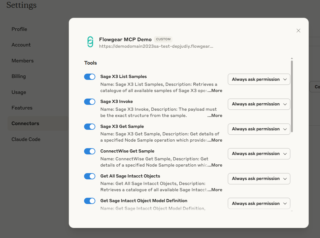 - Configure Permissions for Allowed MCP Workflow Tools - Navigate back to the to Connector Settings from Step 2, and click on the "Your connectors" tab. Then, click on "Configure". This is where you can update whether Claude will 'Always ask permission' or 'Allow unsupervised'. This will determine if explicit approval is needed to invoke a tool in a chat.