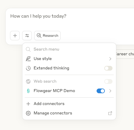 Now, you should have successfully connected Claude to your remote Flowgear MCP Server, and can explore its capabilities in your conversations. Try using the connected tools to automate tasks, access external data, or integrate with your existing Workflows.