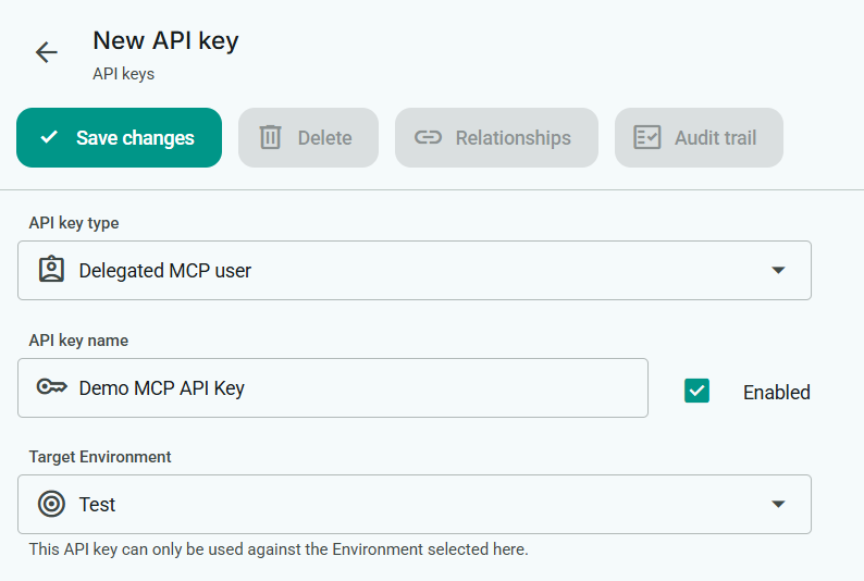 - Create an API Key – Create a dedicated API Key for MCP, with the type set to "Delegated MCP user". This API Key is to be used specifically for MCP in Flowgear, allowing permitted