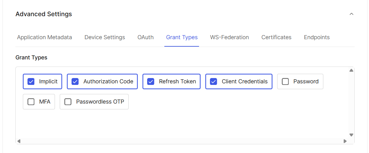 Advanced Settings:ImplicitAuthorization CodeRefresh TokenClient Credentials