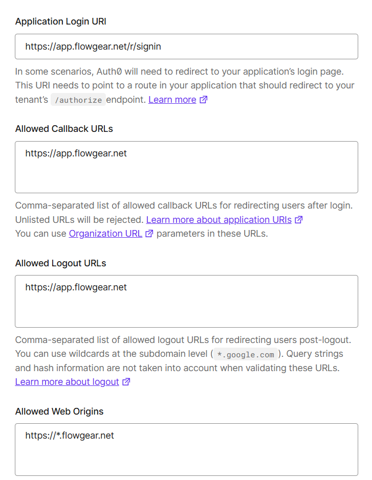 Allowed Logout URLstohttps://app.flowgear.net. - Set the