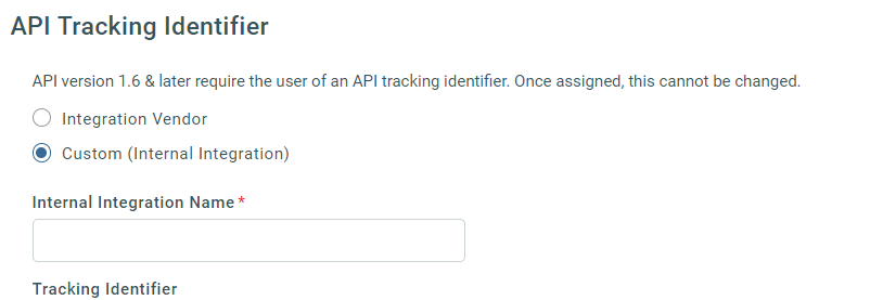 API Tracking Identifiersection, chooseCustom (Internal Integration). This will generate aTracking Identifier. Provide this to Flowgear to configure the Autotask for your Tenant.